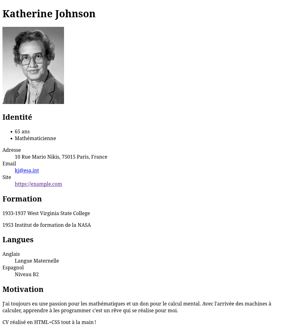 Dans cet exercice, nous allons rédiger une page HTML nommée cv.html. Sans CSS pour changer son apparence, elle aura l’allure de la page donnée en annexe (ou quelque chose d’approchant suivant le style par défaut de votre navigateur)