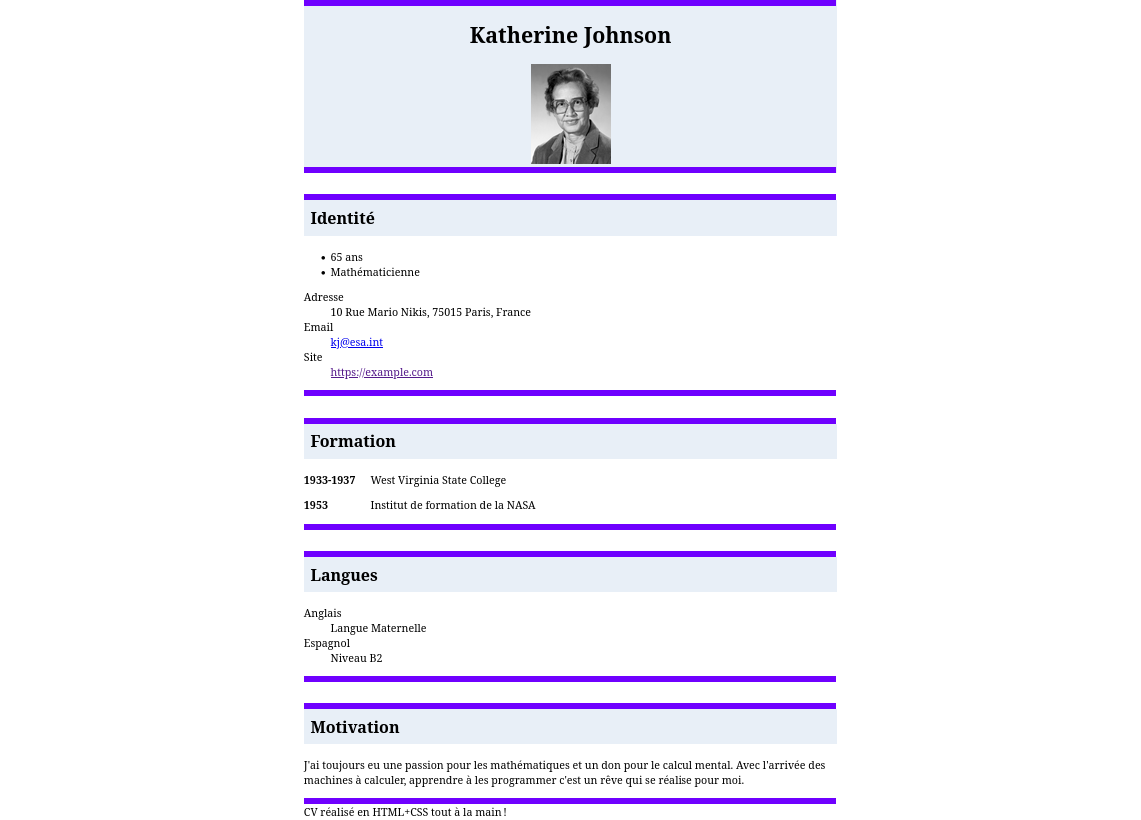 <footer>). - Si vous en avez envie, ajoutez ce qui vous plaît dans ce CV pour le rendre plus joli. Attention à ne rien en retirer pour que je puisse vérifier que vous avez bien suivi les instructions